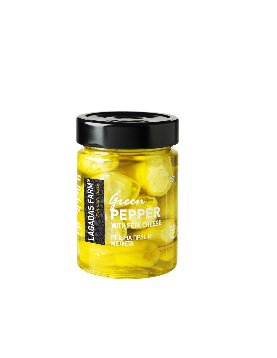 Η πράσινη πιπεριά με φέτα, είναι ένα πολύ ιδιαίτερο ορεκτικό που έχει τις ρίζες του στην Β. Ελλάδα. Είναι ελαφρά καυτερό και πεντανόστιμο προϊόν. Οι καυτερές πιπεριές σας βοηθάνε να τρώτε λιγότερο και να αισθάνεστε χορτάτοι για μεγαλύτερο χρονικό διάστημα. Παράλληλα, οι καυτερές πιπεριές βοηθάνε στην ενίσχυση της άμυνας του στομάχου κατά των λοιμώξεων, στην αύξηση της παραγωγής πεπτικών υγρών που οδηγεί στην καλύτερη πέψη των τροφών. Κατάλληλο για Χορτοφάγους και Βίγκαν. Σημείωση: Η γεύση του προϊόντος, αναδεικνύεται καλύτερα, ξεπλένοντας το προϊόν και σερβίροντας το, με λίγες σταγόνες εξαιρετικά παρθένου ελαιόλαδου.